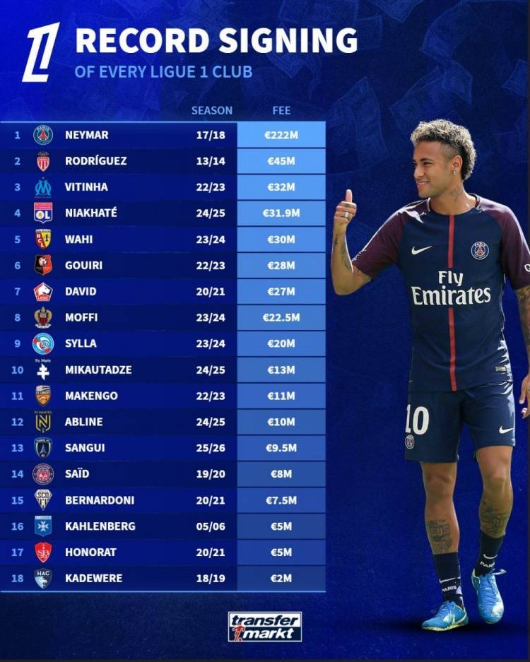 直播吧7月15日讯 德国转会市场统计了法甲各俱乐部的最贵引援,并列出榜单,巴黎2.22亿欧签下内马尔居首。
